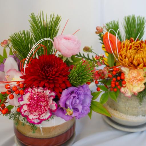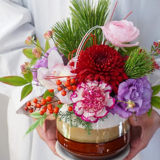 迎春アレンジ~新年をお花と迎えよう~信楽焼の器を使ったちょこんと置けるタイプ