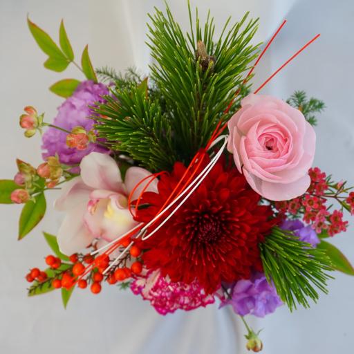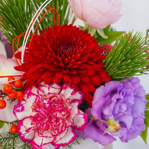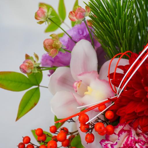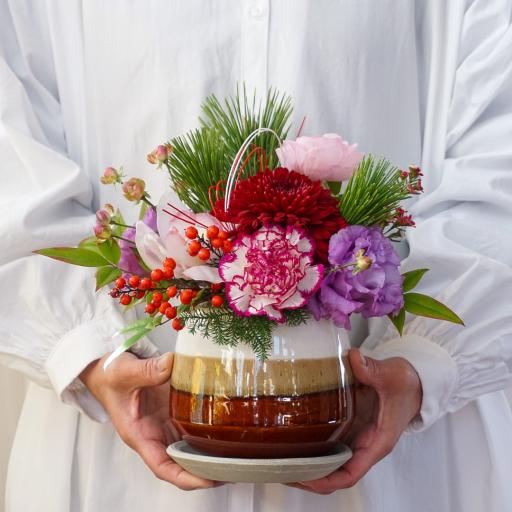 新しい年を、おめでたく華やかに迎えましょう。晴れ晴れしいレッドとパープルのお花をメインに、昔から福が来る・縁起のいいとされている松、南天を使用します。水引きをあしらっておめでたいムードに。スペースをあまりとらないサイズ感でテーブルやカウンターなど限られたスペースに簡単に飾ることができます。使用する器は当店でも人気のある地元滋賀の信楽焼です。穴有でお皿がセットになっているので、お花が終わった後は鉢植えとしてお使いいただけます。二次利用も楽しめるので、ギフトとしてもおすすめです。お客様へ発送する直前に入荷した一番フレッシュなお花を、HANABOZEフローリストが厳選し作成します。