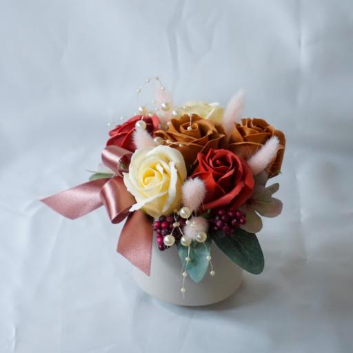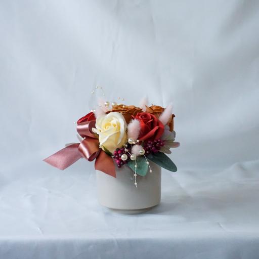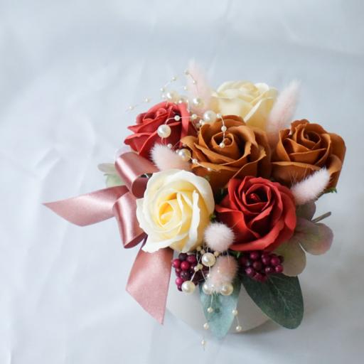 ソープフラワーを使ったアレンジメントです。ソープフラワーとは石鹸で作られた造花です。茎を切ったり水を入れ替えたりする手間がかからないので、お手入れ不要で楽しんでいただけます。直射日光や湿気が多い場所は避けましょう。HANABOZEスタッフが心を込めて作成したひとつだけのアレンジメントになります。