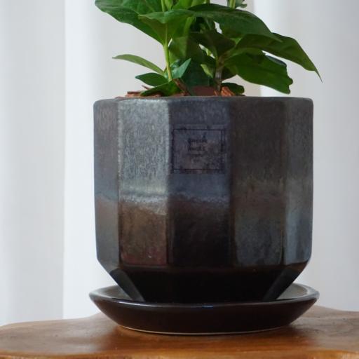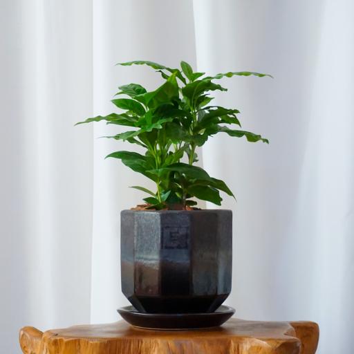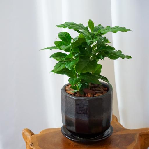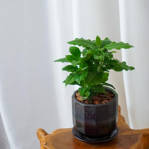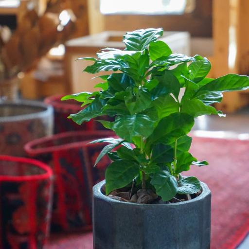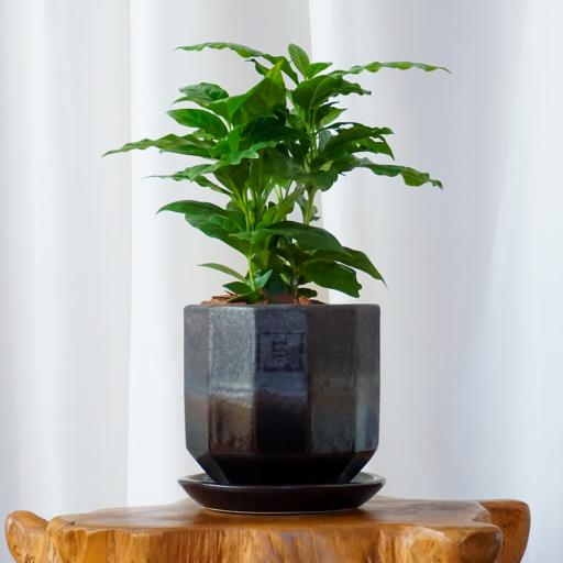 インテリアに馴染みやすいコーヒーノキ。ブラックからグレーのグラデーションカラーが美しい鉢と合わせました。葉の濃いグリーンとダークな鉢はメンズライクな雰囲気の空間にぴったりです。