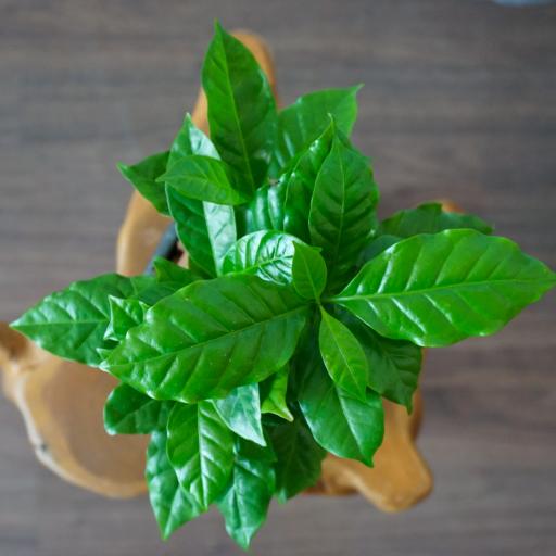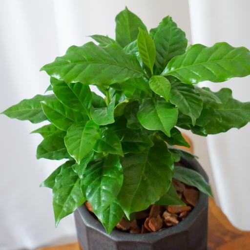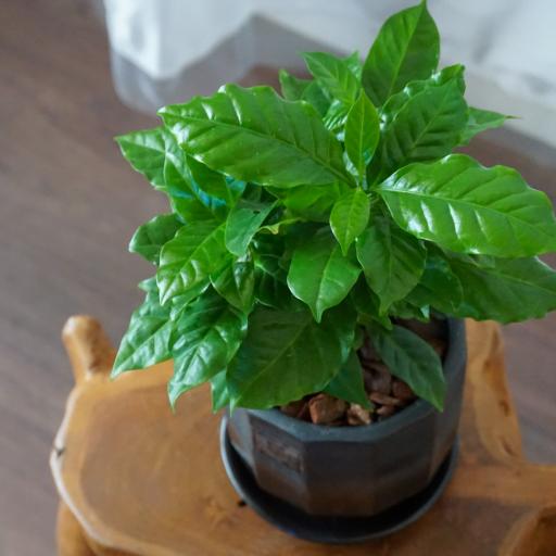 深いグリーンのツヤのある美しい葉が元気な印象をもつコーヒーノキ。樹形があまり崩れず自然に整ってくれるので、管理しやすいのもうれしいポイントです。光に当たるとぴかっと光るのでフレッシュな印象を与えてくれます。株が小さいうちは比較的耐陰性がありますが、コーヒー原産国をイメージすると分かるように本来光が好きな植物です。なるべくお部屋の明るい場所に置くといいでしょう。