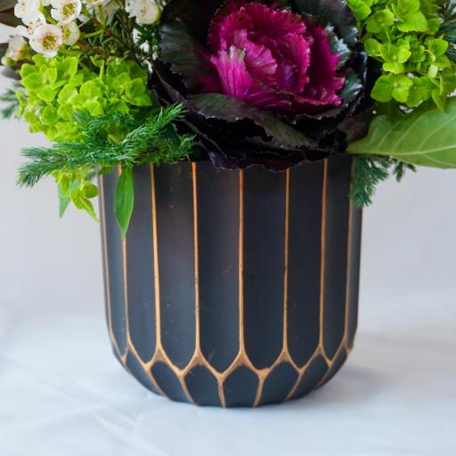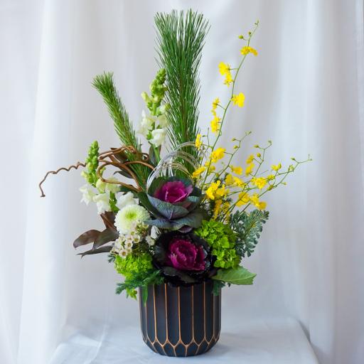 新しい年を、おめでたく華やかに迎えましょう。高さを出したスタイリッシュなお正月アレンジメントです。ブラックにゴールドのストライプが目を引く高級感ある器を使います。動きのある個性的な枝物を使用し、お正月らしいお花を集めます。松は福が来る・縁起がいいとされており、水引きをあしらっておめでたいムードに。高さを出すデザインなので壁際や玄関、受付などオススメです。お客様へ発送する直前に入荷した一番フレッシュなお花を、HANABOZEフローリストが厳選し作成します。