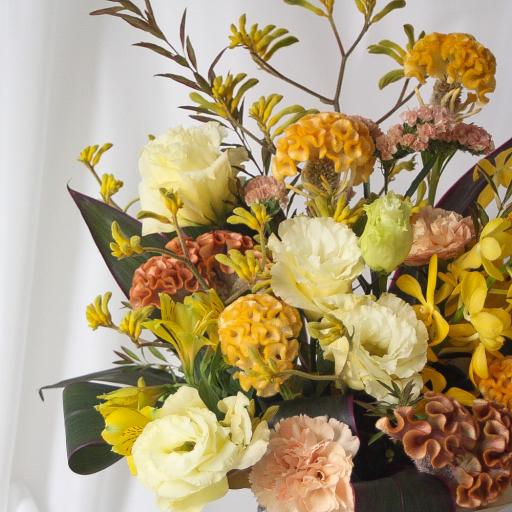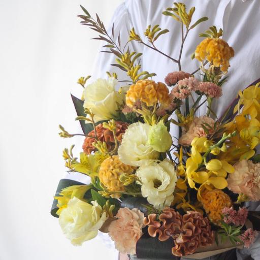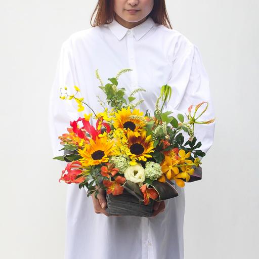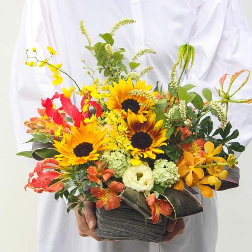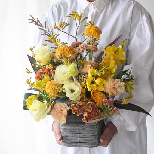 元気が出るビタミンカラー!イエロー、オレンジ系で季節のお花を使用します。飾るだけで一気に空間が華やぎ、パッと明るい気分にさせてくれます。お花に合わせてグリーンもふんだんに使用します。ギフトでも、ご自身用へのご褒美にも。お客様へ発送する直前に入荷した一番フレッシュなお花を、HANABOZEフローリストが厳選し作成します。旬なお花をメインに、なるべく日持ちするように、ボリュームよくお作りします。