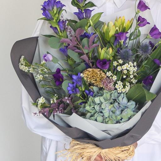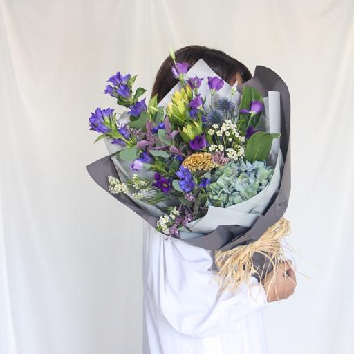 オーダーの多い人気のブルー系花束。パープルを合わせてシックな仕上がりにします。落ち着いた印象でお部屋にあるだけでそこは癒し空間に。お花に合わせてグリーンもふんだんに使用します。ギフトでも、ご自身用へのご褒美にも。お客様へ発送する直前に入荷した一番フレッシュなお花を、HANABOZEフローリストが厳選し作成します。旬なお花をメインに、なるべく日持ちするように、ボリュームよくお作りします。