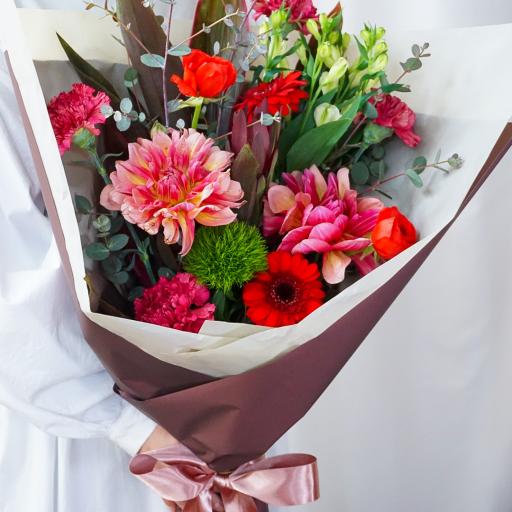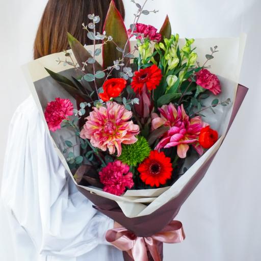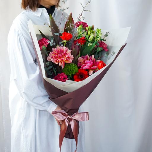 華やか!レッドのお花をメインに使った花束です。飾るだけで一気に空間が華やぎ、パッと明るい気分にさせてくれます。ギフトでも、ご自身用へのご褒美にも。お客様へ発送する直前に入荷した一番フレッシュなお花を、HANABOZEフローリストが厳選し作成します。旬なお花をメインに、なるべく日持ちするように、ボリュームよくお作りします。