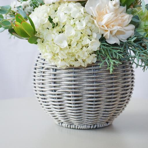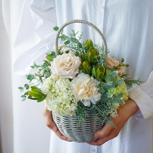 グリーンのアジサイとホワイトのお花をメインに優しくナチュラルな雰囲気のアレンジメントです。コロンとかわいい持ち手つきのバスケットにアレンジしているので、そのまま飾っていただけます。お客様へ発送する直前に入荷した一番フレッシュなお花を、HANABOZEフローリストが厳選し作成します。